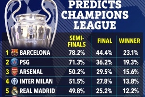 超算预测欧冠晋级概率:巴萨最大热门 巴黎、枪手、国米有望4强